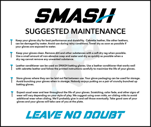 Our batting gloves were made to provide comfort and quality while you do what you do best. For tireless hours of preparation in the cage, or at the plate with the game on the line - SMASH batting gloves will be there for the moments your hard work pays off.